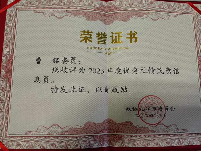 近日,九江市政协对2023年度全市政协系统社情民意信息工作进行表彰。市政协委员、民进会员、公司员工科副科长曹铭老师荣获九江市政协系统“2023年度社情民意优秀信息员”荣誉称号。他提交的《关于加强和改进我市创建文明城市工作的建议》社情民意信息被评为九江市政协系统“2023年度优秀社情民意信息”。