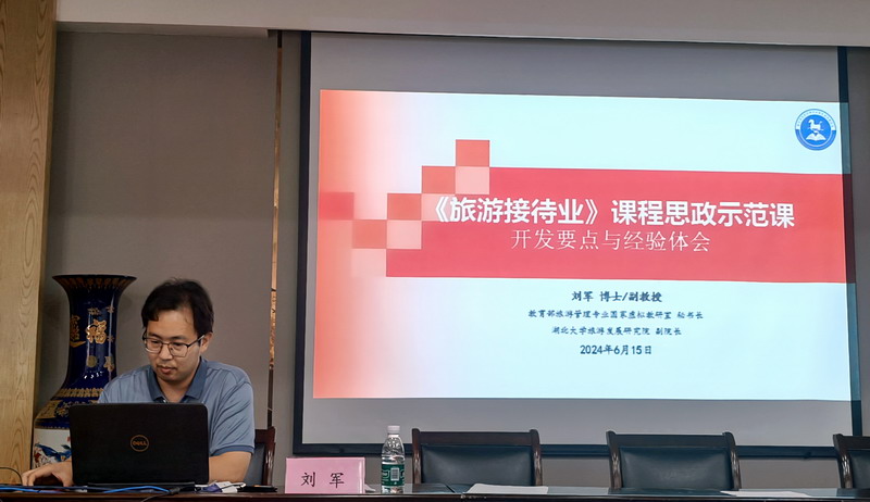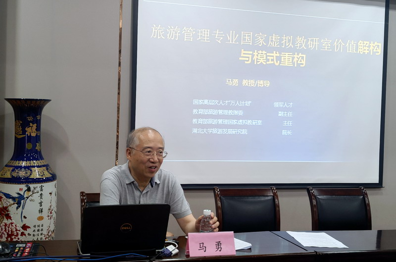 仪式最后,马勇教授为全体教师做了关于旅游管理专业国家虚拟教研室模式解构与重构的讲座。他指出,国家虚拟教研室是基于数字化时代教育部“六卓越一拔尖”和“四新工程”而设立的我国高等院校新型基层教学组织形式,也是贯彻党中央建设世界一流教育强国的重要探索。国家虚拟教研室建设重点体现了三个特征:跨时空与跨院校融合、资源共享与协同创新以及教育研究与实践融合。刘军老师也为老师们带来了旅游业思政课程开发经验分享。他主要就课程体系设置、课程思政内容的充分渗透及其案例资料的精心准备等内容进行了深入讲解,让参会教师对旅游管理专业的课程思政建设有了更深入的认识。至此,教育部旅游管理专业国家虚拟教研室授牌仪式圆满结束,期待未来在双方在共同努力与良好合作下,共建人才培养、科学研究和服务社会的重要平台,继续为旅游业的发展和中国式现代化贡献力量。