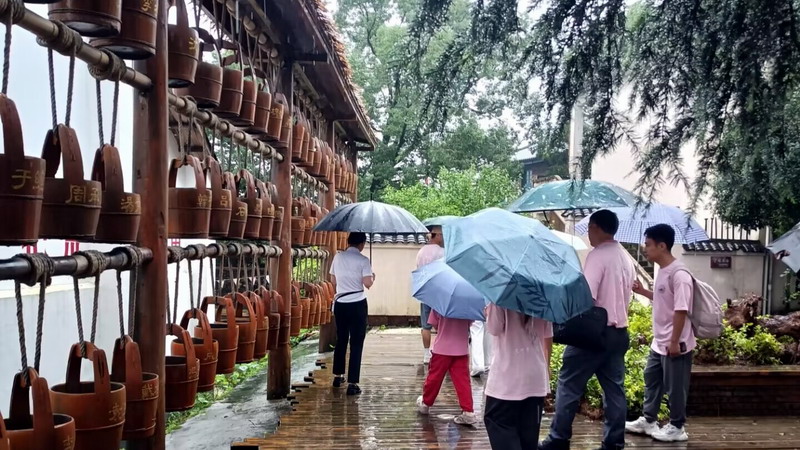“斩棘灭螺挥汗雨,前赴后继战洪魔,胼手胝足未言苦,两迁不辍拓坦途。”饮水思源处被挂起的98只水桶,纪念着98位上海青年垦荒者。实践服务队员们依次参观垦殖场旧址、垦荒文化实践基地、人民公社和青年公园,仔细研究当年垦荒队员开垦荒地时使用的农耕和副业生产工具。简单粗糙的工具,艰苦朴素的环境,向困难进军,把荒地变成良田,拼出了一个水秀山清的共青城市。