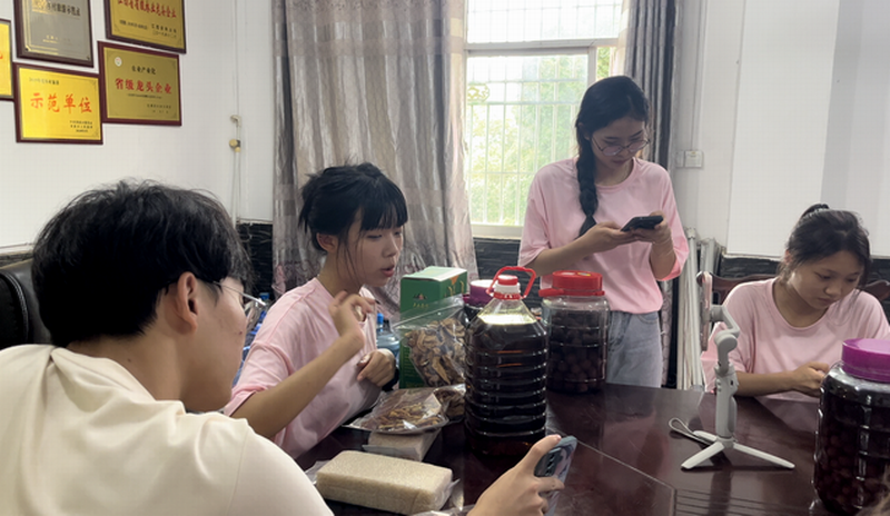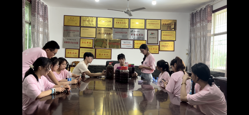 寻访结束后,实践队的队员们又来到潘家湾农产品直播室,进行直播带货试播,对此地的农产品进行宣传。“我们的杨梅酒选取本地优质杨梅果,古法酿造,既保留了酒的香醇,又增添了杨梅的酸甜口感,具有促进消化、消暑解腻、益肾利尿等作用,特别适合女士和老年人饮用……”,两位老员工对着镜头热情地向网友们介绍当地特产,生动的讲解、有效的互动,吸引着观众购买。