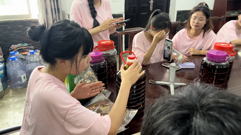 寻访结束后,威廉希尔官网2024年暑期“三下乡”社会实践服务队的队员们又来到潘家湾农产品直播室,进行直播带货试播,两位老员工对着镜头热情地向网友们介绍当地特产,生动的讲解、有效的互动,吸引着观众购买。对于队员们来说,这是一次非常新奇的体验,大家顺利的完成了直播任务,同时也对潘家湾的农产品有一个更深的了解。
