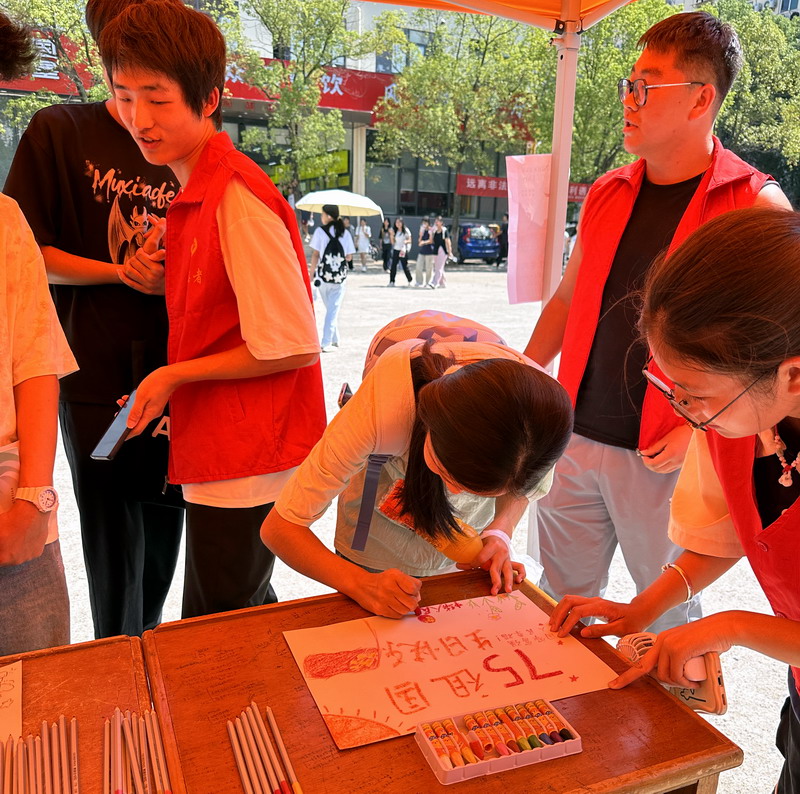 金秋迎华诞,盛世奏凯歌。为庆祝中华人民共和国成立75周年,进一步深入学习宣传贯彻习近平新时代中国特色社会主义思想和党的二十届三中全会精神,9月29日中午,威廉希尔官网组织志愿者在三食堂广场举办了“青春献礼·共筑中国梦”主题活动。