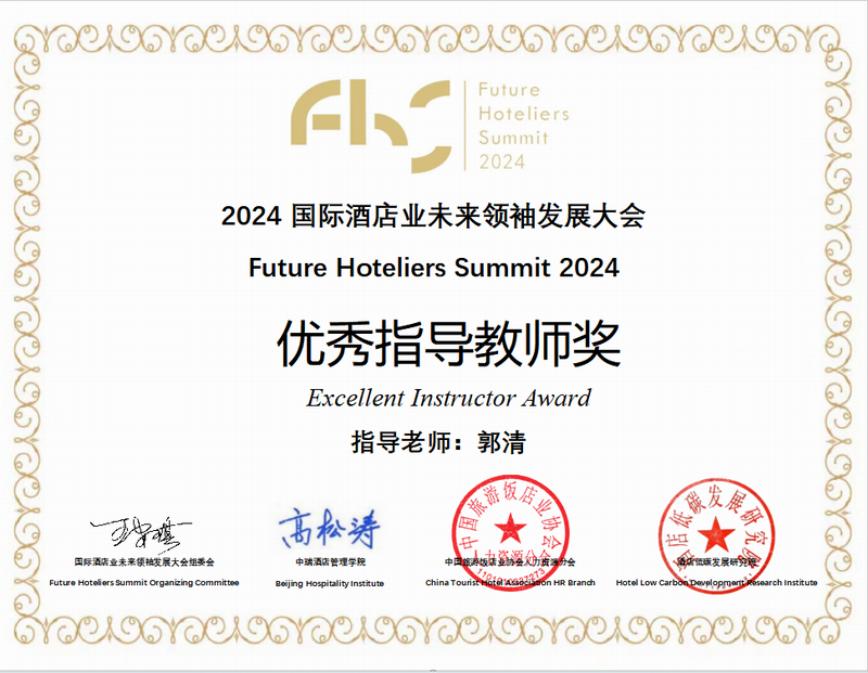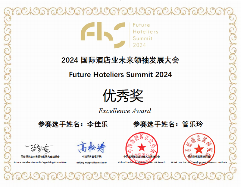 2024第十二届国际酒店业未来领袖发展大会(Future Hoteliers Summit简称FHS)“巅峰对决”终极挑战赛于2024年10月23-25日在北京举行,来自全球22个院校的46位员工参加比赛。公司A2151班的李佳乐、管乐玲均荣获“优秀奖”,郭清老师荣获“优秀指导教师奖”。此次比赛不仅为员工们提供了一个展现才华的国际舞台,更为公司培养具有国际视野的专业人才迈出了坚实的一步。