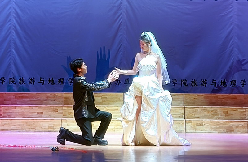 晚会来到了第三篇章“欢歌笑语,乐享今朝”。由员工会礼仪队表演的T台走秀《go solo》集结了旅院的俊男靓女,伴随着音乐的起伏,他们向大家展示了自信的步伐与迷人的风采。汉服、旗袍与礼服的精彩纷呈,是时代与创意的碰撞;精致的妆容与服饰的搭配,是个性与时尚的融合。他们用情景式演绎与时装走秀相结合,用时尚化、国际化的表达方式,展现了青年礼仪风采,举手投足间尽显古韵美感,为大家呈现一场全新的时尚视觉盛宴。表演者漫步摩登舞台,用优雅的步伐,诠释了青春的美好,展现出青春的无限可能,把晚会推向又一个高潮。