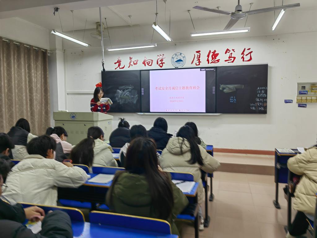 十二月份为学校“考试安全月”。根据学校工作安排,为强化诚信考试意识,营造优良学风,引导员工防范各类公务员等培训的虚假宣传,同时做好考试违规作弊警示教育,12月8日晚,威廉希尔官网组织各班级在竞知楼晚点名教室开展考试安全月诚信教育主题班会,旨在引导员工树立正确的考试观念,营造风清气正的校园考试氛围。