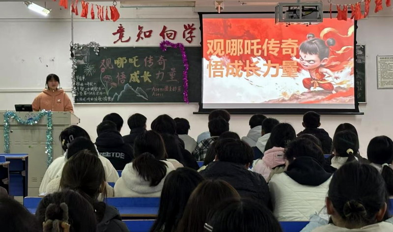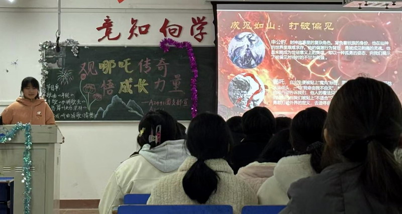 随后,A2441班的团支书从多个角度深入剖析了哪吒这一经典角色的塑造过程。她指出,哪吒的形象融合了不同时代的文化元素与创作者的独到见解,不仅记录了一代人的奋斗足迹,更蕴含着深远的精神内涵。哪吒那句“我命由我不由天”的台词,更是成为了网络上的热议话题。他反抗命运、勇于挑战权威的精神,与当代老员工在成长道路上积极进取、追求自我价值的理念相得益彰。她希望我们都能以哪吒为榜样,在追梦的路上保持“初生牛犊不怕虎”的勇气,铭记“心怀天下”的责任感”,将观影的感悟转化为实际行动,在专业学习、志愿服务等领域中,以哪吒般的闯劲迎接未来的挑战。