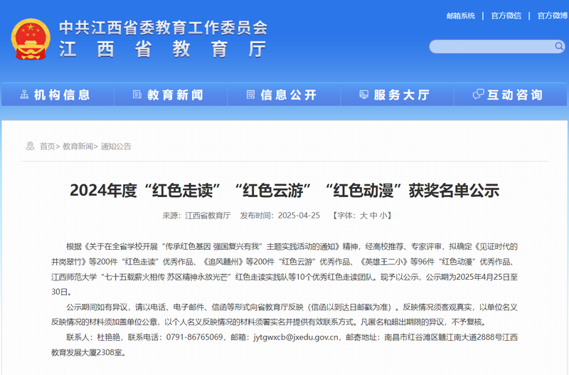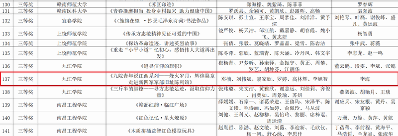 4月25日,江西省教育厅公布了2024年度“红色走读”“红色云游”“红色动漫”拟获奖名单,公司由李海老师指导,邓楠、刘伟斌、裘家欣、罗婷、高林辉、李旭智等同学共同创作的作品《九院青年说江西系列——烽火岁月,辉煌篇章 走进新四军军部旧址陈列馆》在众多作品中脱颖而出,斩获三等奖,彰显了学院在红色文化传承与教育实践方面的突出成果。