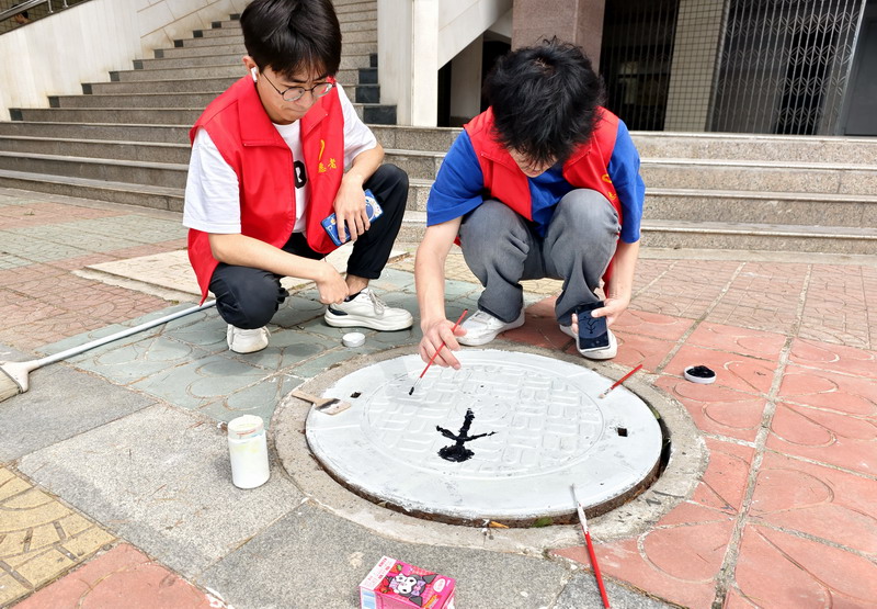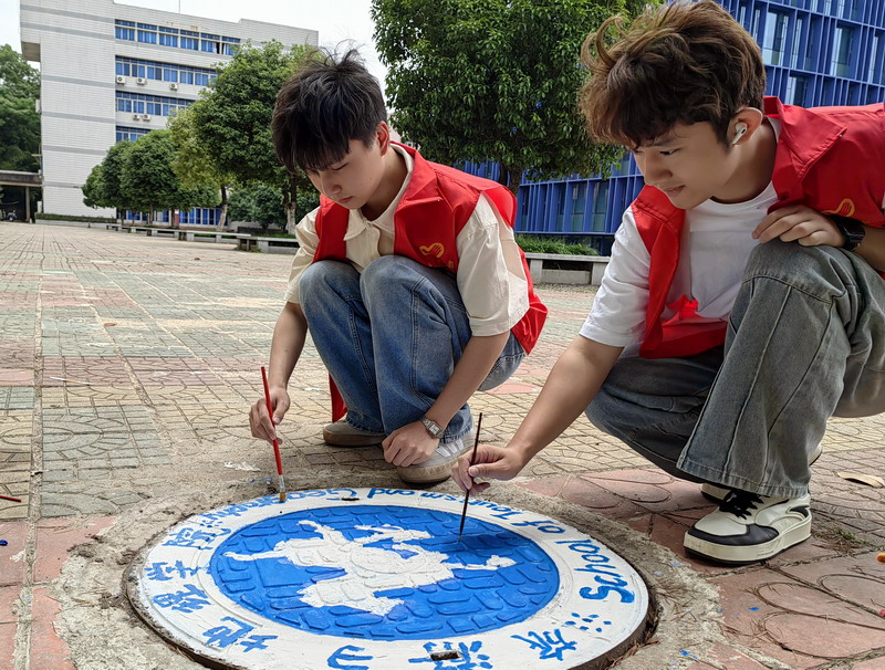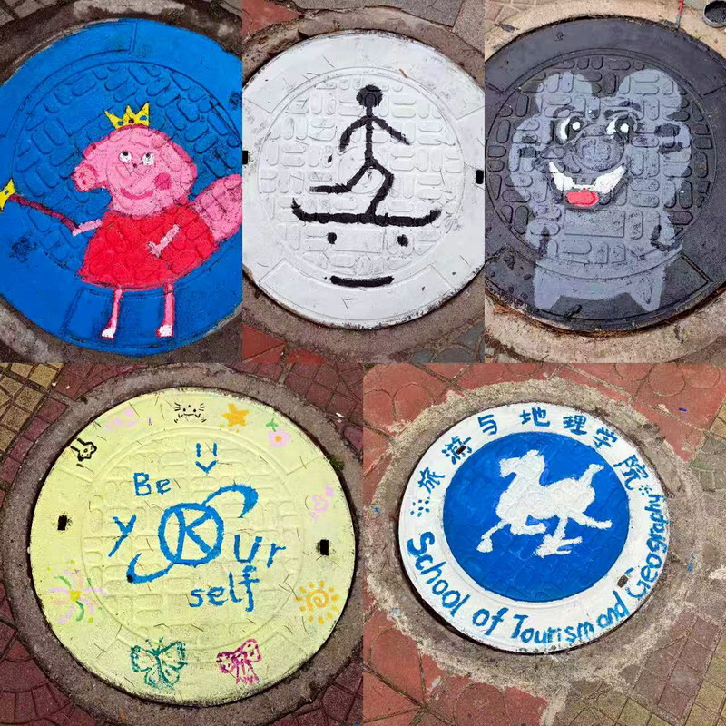 活动现场,12名志愿者们分为四个小组,每个小组的志愿者们纷纷化身创意小能手。他们以井盖为画布,运用丰富的色彩和巧妙的构思,创作出一幅幅精彩的作品。有的井盖绘上了憨态可掬的小猪佩奇卡通形象,为校园带来了童趣与欢乐;有的则展现了专业元素,像学院logo,彰显了学院特色与文化底蕴。还有充满活力的简笔画小人,仿佛在邀请师生们一同感受运动的快乐。
