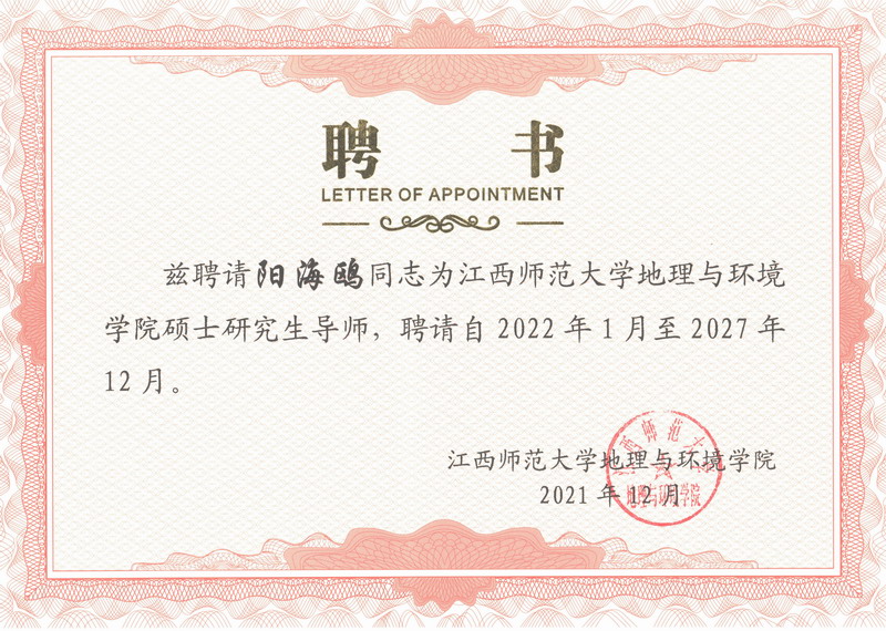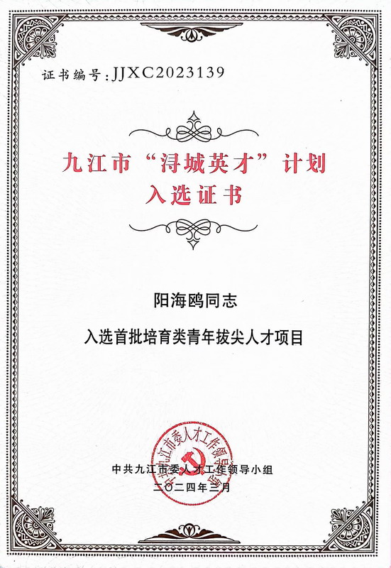 勇挑重担,钻出创新温泉。她积极服务九江社会经济发展,被推荐为九江市自然资源局项目评审专家,多次参加土地类项目评审工作。她被推选为国家自然科学基金评审专家和多个SCI期刊审稿人,担任江西师大兼职硕导,已形成一定的学术声誉。2024年,她入选九江市第一批浔城英才计划“培育类-青年拔尖人才”项目。