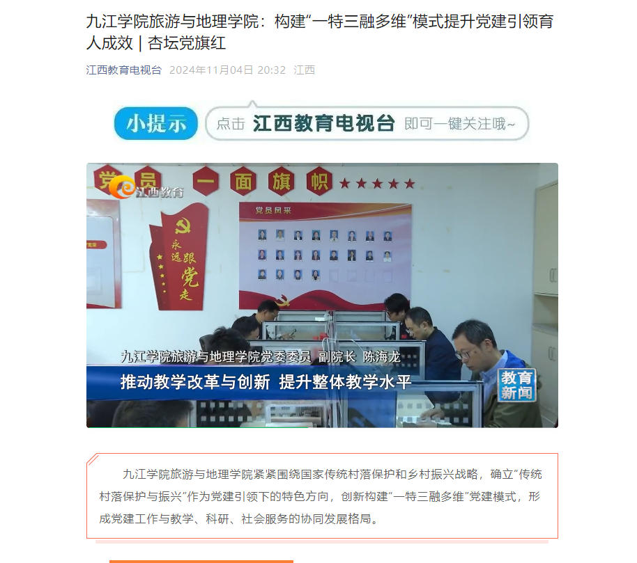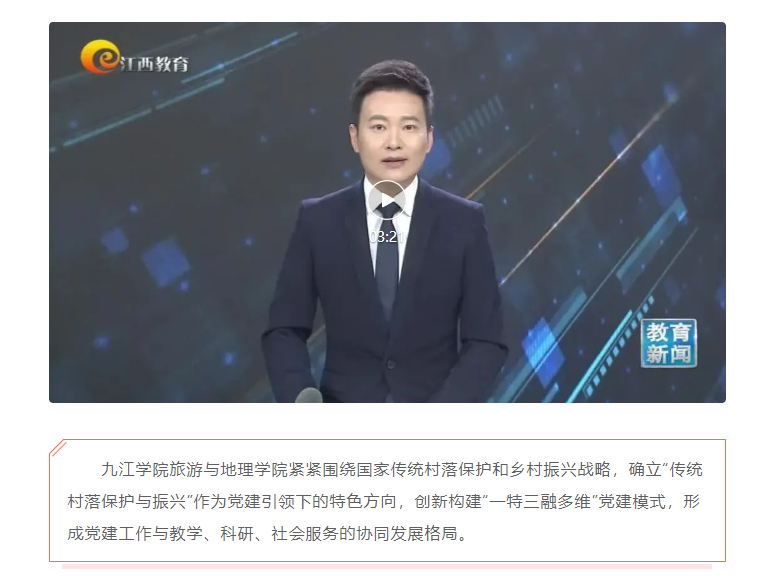 威廉希尔官网紧紧围绕国家传统村落保护和乡村振兴战略,确立“传统村落保护与振兴”作为党建引领下的特色方向,创新构建“一特三融多维”党建模式,形成党建工作与教学、科研、社会服务的协同发展格局。(江西教育电视台2024年11月4日 https://mp.weixin.qq.com/s/CU1vN5C5htMMbxaaLvzX8A )