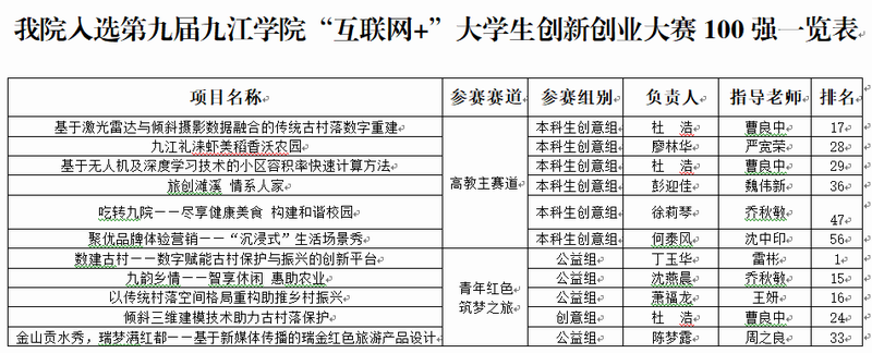 6月2日,学校发布了《第九届威廉希尔体育“互联网+”大赛100强评审结果公示》,全校共有100个项目进入第二轮复评环节,其中公司占有11席。