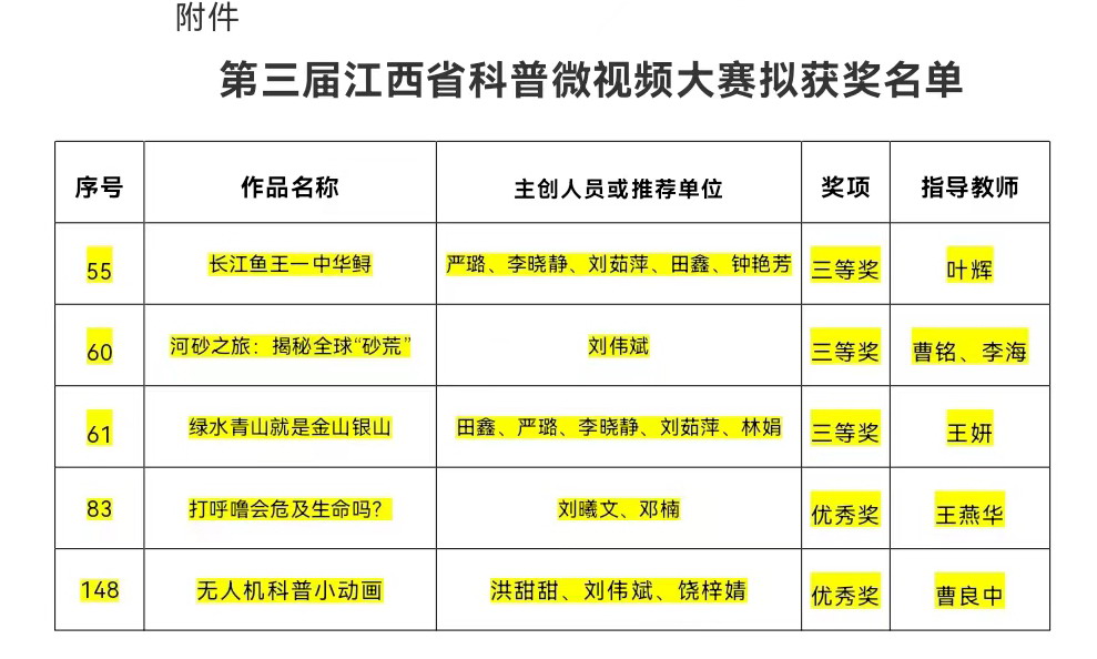 赛事通知发布以来,威廉希尔官网高度重视,精心组织。参赛团队充分发扬了团结合作,求实创新的精神,迎难而上,积极备战,最终获得理想成绩。其中,叶辉老师指导的严璐、李晓静、刘茹萍、田鑫、钟艳芳等创作的《长江鱼王一中华鲜》、曹铭、李海老师指导的刘伟斌创作的《河砂之旅:揭秘全球“砂荒”》、王妍老师指导的田鑫、严璐、李晓静、刘茹萍、林娟等创作的《绿水青山就是金山银山》获得三等奖,王燕华老师指导的刘曦文、邓楠创作的《打呼噜会危及生命吗?》、曹良中老师指导的洪甜甜、刘伟斌、饶梓婧等创作的《无人机科普小动画》获得优秀奖。这是继公司学子在第二届江西省科普视频大赛斩获4个奖项后不负众望,再一次在此项比赛中荣获佳绩。