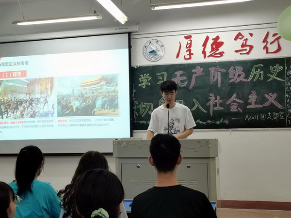 活动伊始,各个班级全体同学全体起立齐唱中国共青团团歌《光荣啊,中国共青团!》带动起了活动氛围。旅游A2011班主持人带领全班同学,深刻学习了解了无产阶级在中国历史上的开始、发展与爆发,结合党百年来的发展历史,让同学们深入了解了无产阶级发展的曲折与顽强不屈。旅游A2012班团支部开展了以“无产阶级奋进”为主题的历史知识竞答,使同学们在思考探索中学习无产阶级的发展历史。A2041班同学则学习观看了近代社会主义改革开放的学习视频,让同学们了解学习无产阶级在中国改革开放过程中发挥的巨大作用。A2051班同学朗读《领风者》并进行主题演讲《党史在心中》以此来深刻赞颂无产阶级力量的伟大及对党对国家深切的热爱。