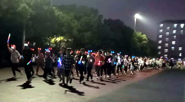 当夜幕降临,操场上,微风伴着湿润的空气,欢声与笑语在这里回荡。当晚7时,荧光亮起,同学们手执荧光棒,头戴荧光环奋力奔跑着,点点荧光流动在校园中,青春的热情化作一个个跃动的光点点亮夜晚的校园,把整个校园装点成一个荧光闪耀的欢乐海洋。活动结束后,参赛者们一起合影留念。
