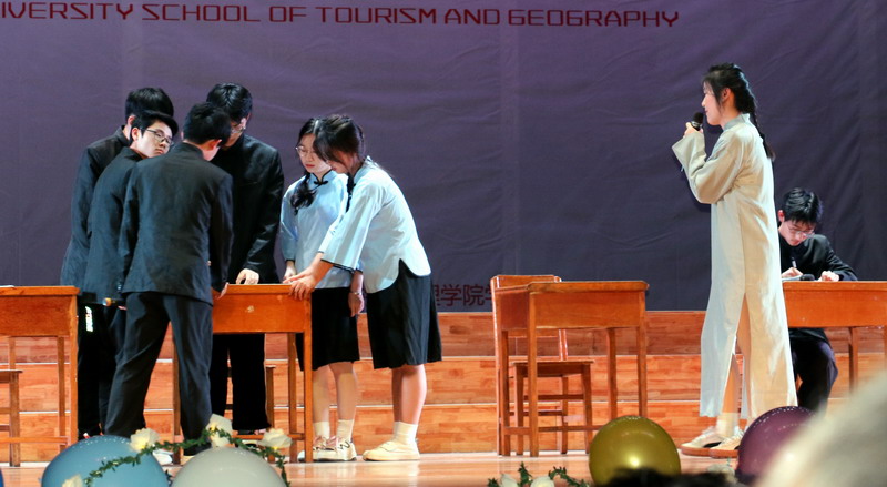 由员工会志愿者部、文体服务部、权益服务部、导游队等带来的节目——《旅院小日常》,节目通过幕布剧的形式用影子呈现出一个鲜活的老员工活,从报到、军训、求学、恋爱、校园活动……一首歌,一场剧,将老员工活中的各种情感和经历生动地展现出来。从相遇到相识再到相知,老员工们一起学习、一起玩闹、一起分享喜怒哀乐。无论是欢腾的、炽热的、理想的,还是迷茫的、孤独的、不安的,这些都是大学时代最真实、最热烈的青春记忆。通过这个节目给同学们传达一个正确的价值引导和价值导向,不虚度光阴,做好人生规划。同时,也希望同学们能尽快融入老员工活中来,多看、多学、多走,去感受丰富多彩的老员工活动。