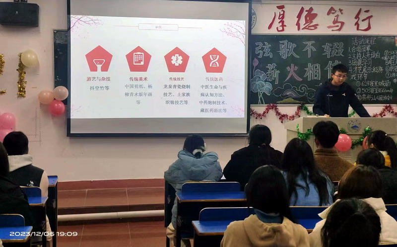 非物质文化遗产既是历史发展的见证,又是珍贵的、具有重要价值的文化资源。我国非物质文化遗产所蕴含的中华民族特有的精神价值、思维方式、想象力和文化意识,是维护我国文化身份和文化主权的基本依据。加强非物质文化遗产保护,不仅是国家和民族发展的需要,也是国际社会文明对话和人类社会可持续发展的必然要求。活动中,各班团支书通过PPT演示和视频播放等形式,向同学们生动讲述了中华传统文化的历史和发展,讲解传承文化、弘扬传统的重要性,在同学们心中播下了保护非遗文化的种子。期间,有的班级还开展了传统文化知识竞赛,通过问答的形式,加深了同学们对传统文化的了解;有的班级开展了传统文化才艺展示,同学们通过剧目演绎、诗歌朗诵、舞蹈表演、手抄报等形式,情景式体验非遗魅力,展现对传统文化的热爱,也进一步加深了同学们对中华优秀非遗文化的认同感。