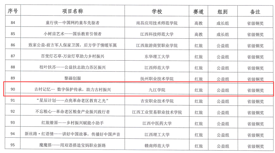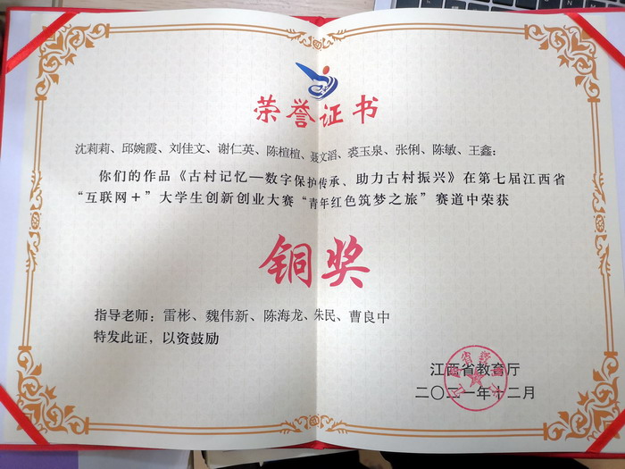 近日,江西省教育厅公布了《“建行杯”第七届江西省“互联网+”老员工创新创业大赛获奖名单》。公司雷彬、魏伟新、陈海龙、朱民、曹良中等老师指导的“古村记忆-数字保护传承,助力古村振兴”项目在层层筛选下,代表公司取得了红旅赛道公益组的铜奖的优秀成绩,这是他们团队多年积累的成果。