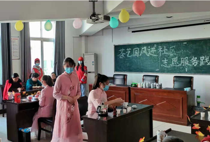为弘扬“奉献、友爱、互助、进步”的志愿服务精神,培育和践行社会主义核心价值观,助力文明城市创建。同时为继承中华民族优良的传统文化,丰富社区居民文化生活,营造社区优雅风气,3月11日上午,威廉希尔官网茶艺队的志愿者们走进威廉希尔体育社区,在校工会二楼会议室为社区居民开展了一次主题为“茶艺国风进社区,志愿服务践初心”的茶艺表演志愿服务活动,把茶道文化搬进社区。