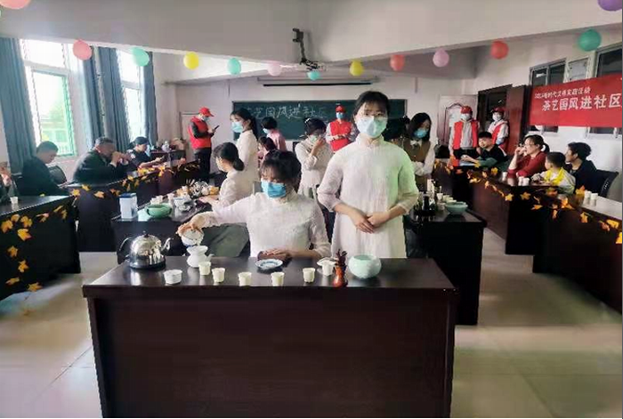 精彩的表演激起了居民们的兴趣,他们也想体验一下泡茶的乐趣。大家表现得疏漏百出,但经过队员们的耐心纠正,用心一一指点后,居民们不仅掌握了泡茶的流程,而且整个动作优雅有致。现场其乐融融,互相切磋自己的茶艺,大家不仅学得开心,还开阔了眼界,增长了知识,感受到了中国茶文化的博大精深,还增进了邻里友情,丰富了社区居民的精神文化生活。