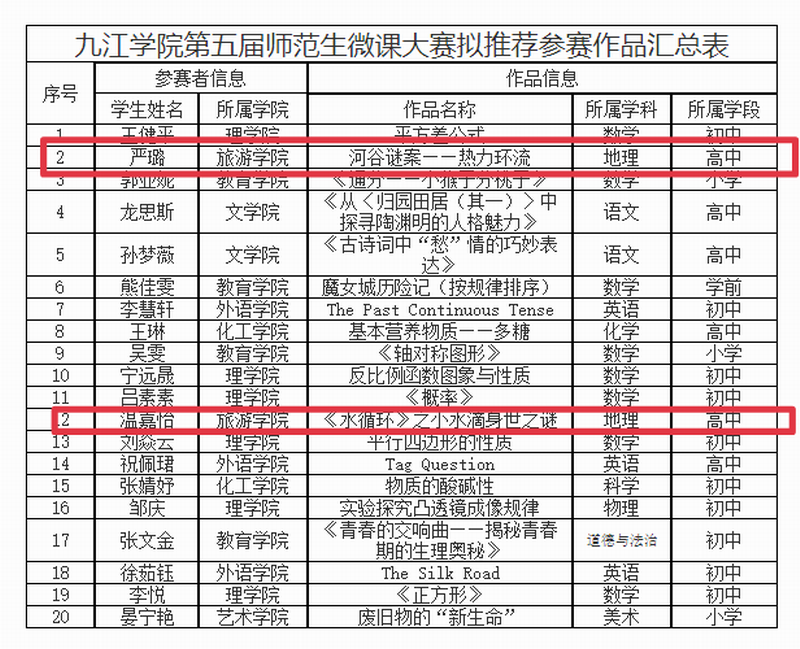 公司由张力老师指导的严璐同学的作品《河谷谜案——热力环流》和王文彩老师指导的温嘉怡同学的作品《〈水循环〉之小水滴身世之谜》榜上有名,被推荐参加第五届全国师范生微课大赛。