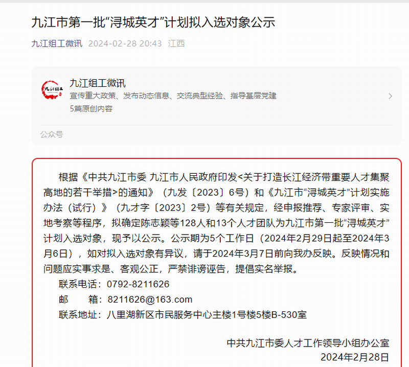 此次评选是根据《中共九江市委 九江市人民政府印发<关于打造长江经济带重要人才集聚高地的若干举措>的通知》(九发〔2023〕6号)和《九江市“浔城英才”计划实施办法(试行)》(九才字〔2023〕2号)等有关规定,经申报推荐、专家评审、实地考察等程序,确定128人和13个人才团队为九江市第一批“浔城英才”计划入选对象。公司阳海鸥博士入选“培育类-青年拔尖人才”项目。据悉全校共有9人和1个团队入选。