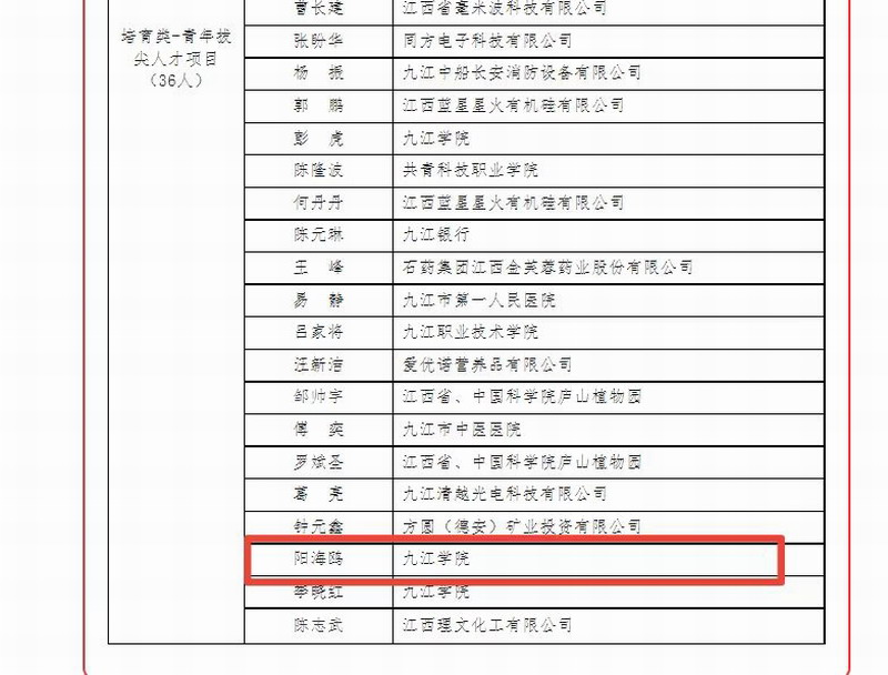 近日,九江市委人才工作领导小组办公室发布九江市第一批“浔城英才”计划拟入选对象公示名单,威廉希尔官网阳海鸥博士成功入选。