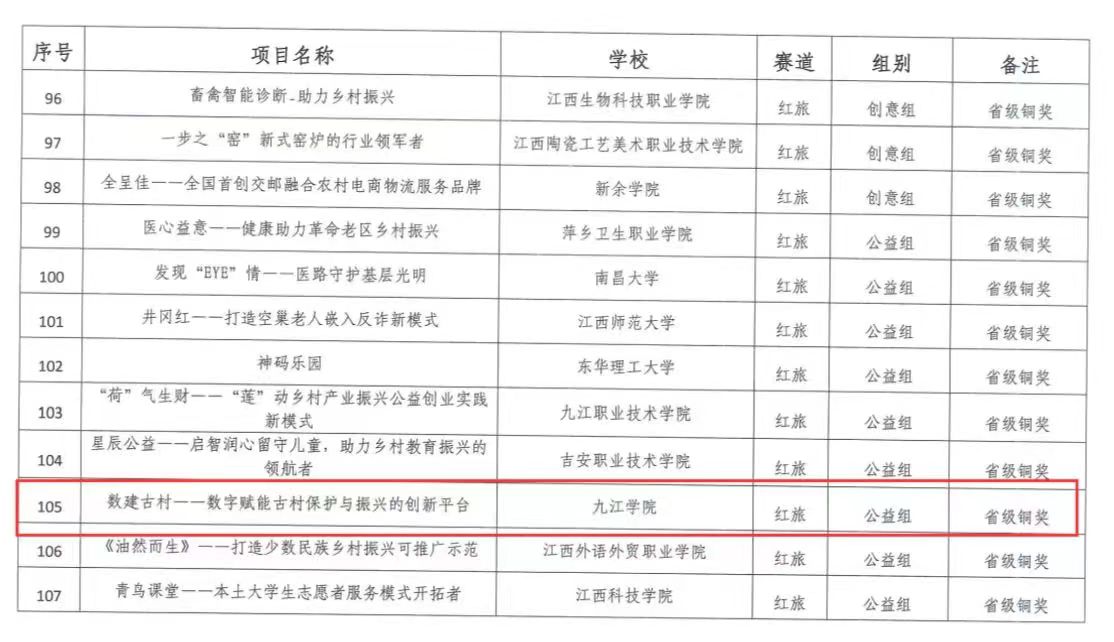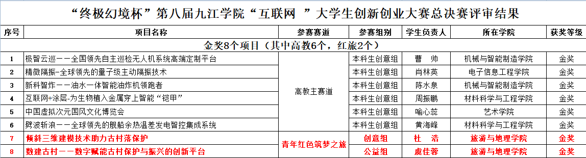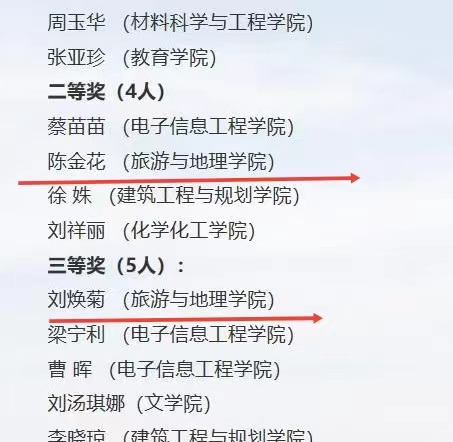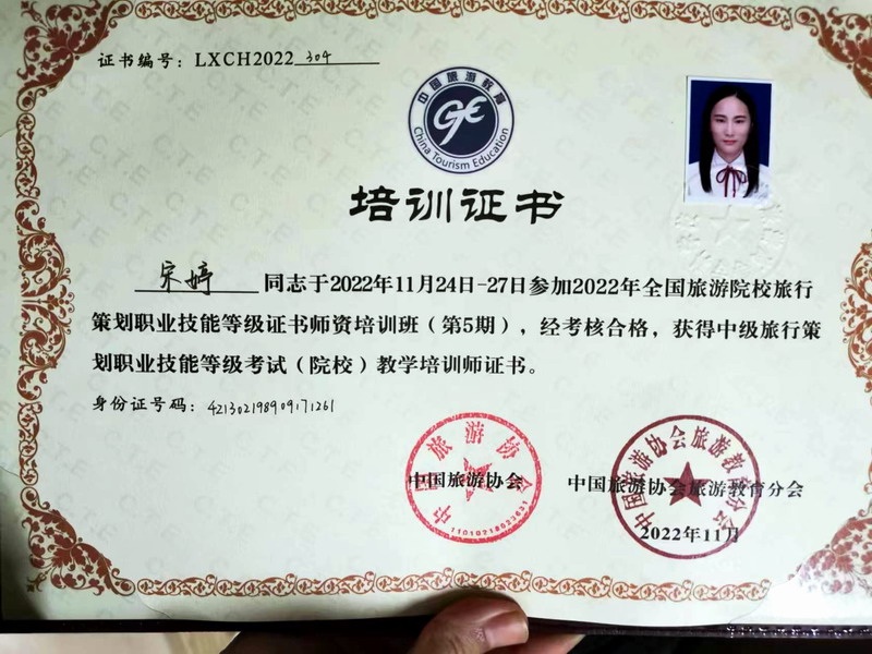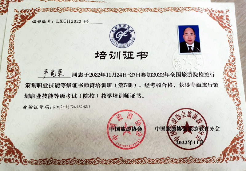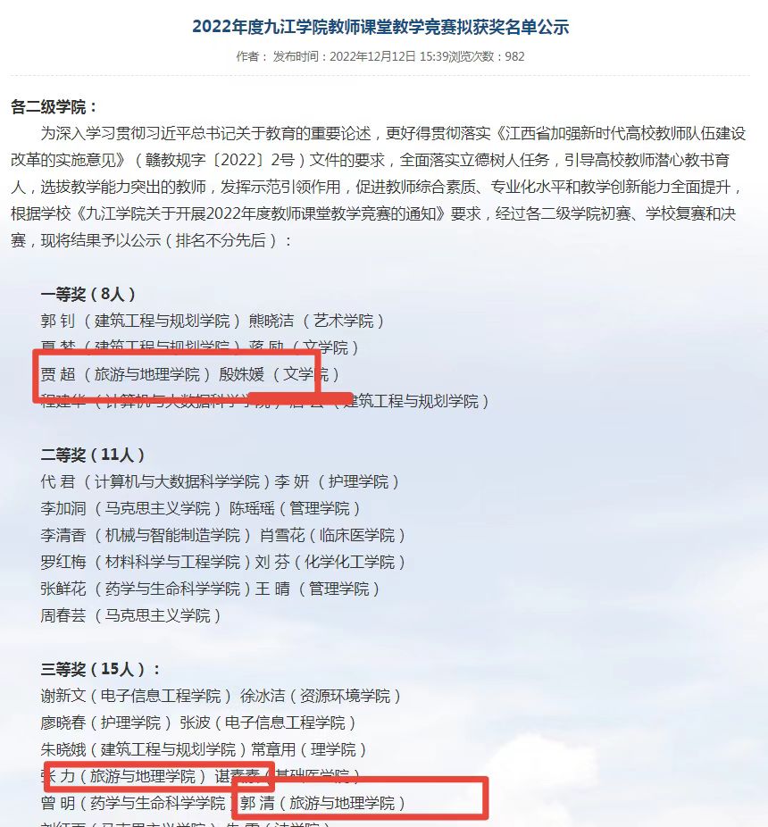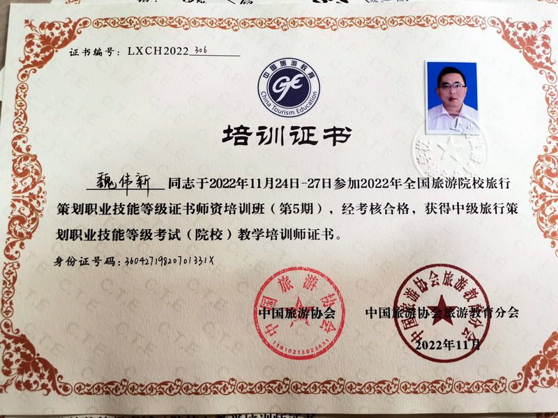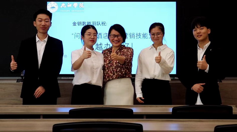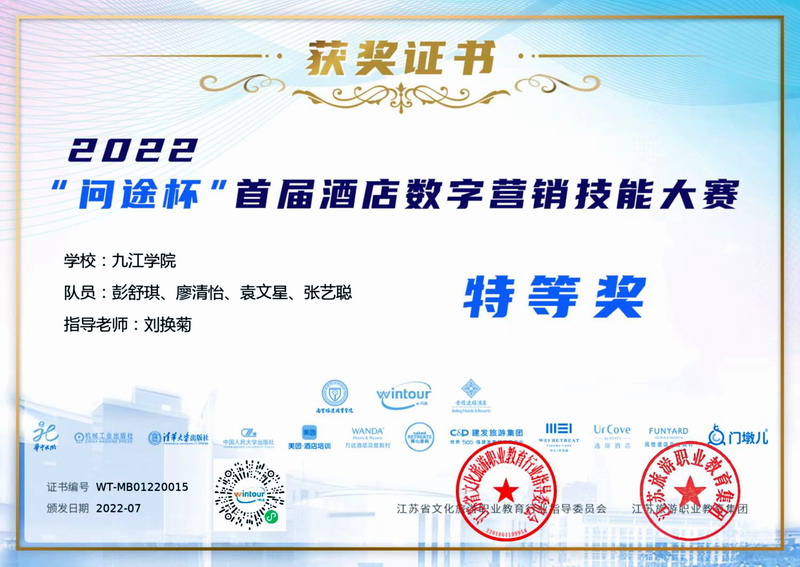 刘换菊老师指导,彭舒琪、廖清怡、袁文星、张艺聪4名同学组成的“金钥匙胜羽队”在第一届“问途杯”酒店数字营销技能大赛总决赛中喜获本科组特等奖,刘换菊老师荣获“优秀指导老师”奖。雷彬老师指导的《数建古村——数字赋能古村保护与振兴的创新平台》项目获第八届江西省“互联网+”老员工创新创业大赛“青年红色筑梦之旅”赛道公益组铜奖。3名青年教师在2022年度学校教师课堂教学竞赛中喜获佳绩,贾超老师获得一等奖,张力、郭清两位老师获得三等奖。沈艳晶老师荣获学校2022年辅导员素质能力大赛一等奖。陈金花老师荣获学校第二届教师教学创新大赛中级及以下组三等奖。陈金花老师和刘焕菊老师在学校混合式教学设计创新大赛中分别获得二等奖和三等奖。5名教师在学校2022年教师节庆祝大会上受到表彰,雷彬、严宽荣、赵军凯荣获优秀教师称号,徐培荣获优秀教育工作者称号,王妍荣获优秀班主任称号。张建星、贾超获得学校就业工作先进个人称号。魏伟新、宋婷、严宽荣获得中级旅行策划职业技能等级考试(院校)教学培训师证书。4名教师获省旅游协会通报表扬,李松志荣获 “突出贡献人物”称号,严宽荣、乔秋敏荣获“教学名师”称号,魏伟新荣获“杰出青年教师”称号。