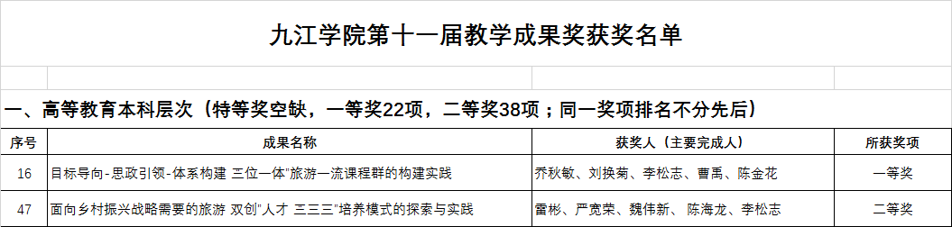 积极申报旅游管理省级教学团队。2022年,学院旅游管理专业获批国家级一流本科专业,江西省四星级本科专业。旅游管理省级教学团队通过中期建设检查,并积极推进地理科学教学团队申报及建设工作。2022年,学院申报校级教学成果奖5项,乔秋敏等老师负责的《目标导向-思政引领-体系构建“三位一体”旅游一流课程群的构建实践》获校级一等奖,雷彬等老师负责的《面向乡村振兴战略需要的旅游“双创”人才“三三三”培养模式的探索与实践》获校级二等奖。