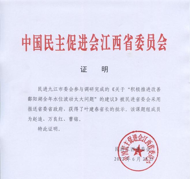 今年1月初,民进江西省委会围绕《民进中央2021年对口江西省开展长江生态环境保护民主监督报告(情况反馈稿)》中有关“积极推动改善鄱阳湖全年水位波动太大问题”的建议组织了专题调查研究。公司教师、民进威廉希尔体育支部会员赵追,曹铭作为长江生态环境保护民主监督工作民进江西省专家参与调研,他们参与完成的《关于“积极推进改善鄱阳湖全年水位波动太大问题”的建议》被民进省委会采用报送省委省政府,获得了省政府叶建春省长肯定性批示。