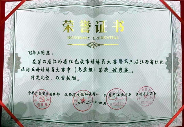 优秀员工获奖!公司A1511班员工陈家玉在全省红色故事讲解员比赛中获奖