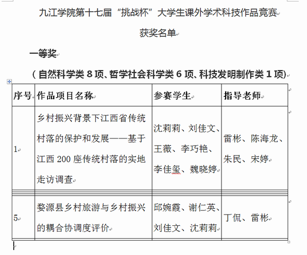 由雷彬、陈海龙、朱民、宋婷等老师指导,沈莉莉、刘佳文、王薇、李巧艳、李佳玺、魏晓婷等6名同学组成团队的参赛作品“乡村振兴背景下江西省传统村落的保护和发展——基于江西200座传统村落的实地走访调查”和丁侃、雷彬老师指导,邱婉霞、谢仁英、刘佳文、沈莉莉等4名同学组成团队的参赛作品“婺源县乡村旅游与乡村振兴的耦合协调度评价”荣获一等奖。