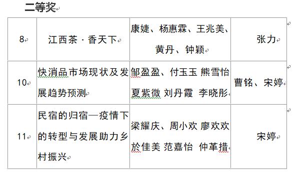 由张力老师指导,康婕、杨惠霖、王兆美、黄丹、钟颖等5名同学组成的团队的参作品“江西茶・香天下”、曹铭、宋婷老师指导,邹盈盈、付玉玉 熊雪怡、夏紫微、刘丹霞、李晓彤等6名同学组成的团队的参赛作品“快消品市场现状及发展趋势预测”和宋婷老师指导,梁耀庆、周小欢、廖欢欢、於佳美、范嘉怡、仲革措等6名同学组成的团队的作品“民宿的归宿—疫情下的转型与发展助力乡村振兴”获得二等奖。