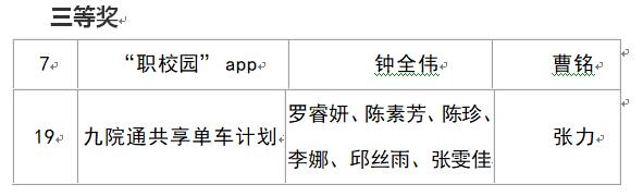 由曹铭老师指导,钟全伟同学的参赛作品“‘职校园’app”和由张力老师指导、罗睿妍、陈素芳、陈珍、李娜、邱丝雨、张雯佳等6名同学组成团队的参赛作品“九院通共享单车计划”获得三等奖。