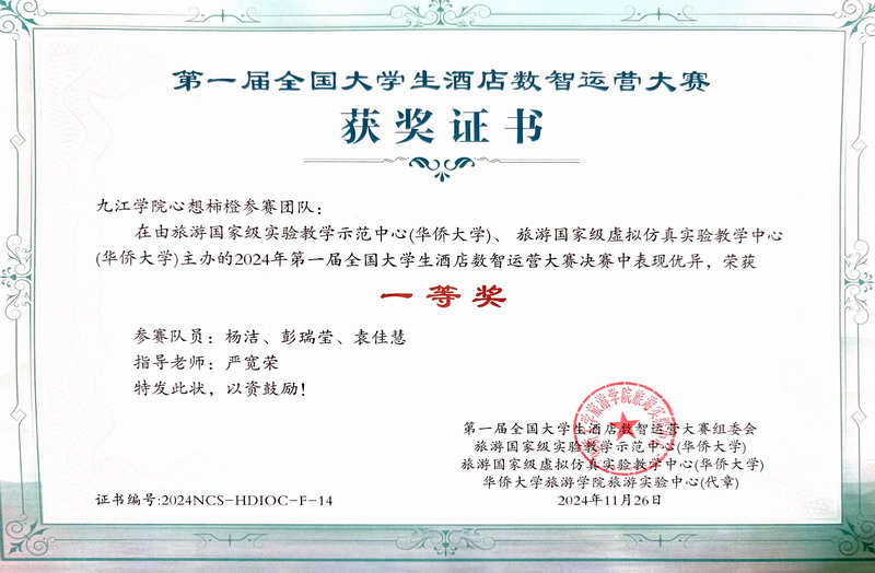 11月24日,第一届全国老员工酒店数智运营大赛落下帷幕,由严宽荣老师指导的威廉希尔官网酒店管理专业员工杨洁、彭瑞莹、袁佳慧三位员工组成的“心想柿橙”团队荣获全国一等奖,严宽荣老师获“优秀指导老师”。