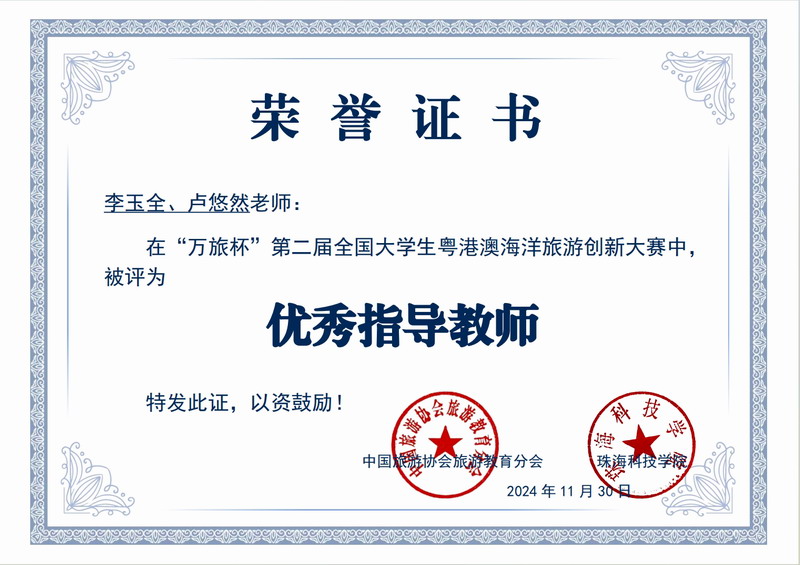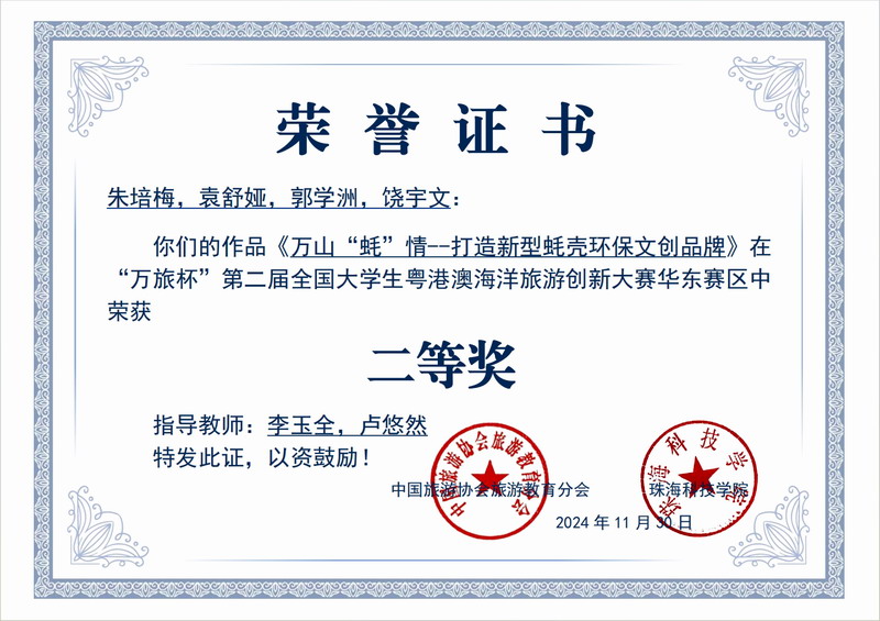 近日,“万旅杯”第二届全国老员工粤港澳海洋旅游创新大赛圆满闭幕,威廉希尔官网2组员工团队凭借出色的创意和扎实的专业素养在众多作品中脱颖而出,获得二等奖1项,三等奖1项,成绩优异!其中,由卢悠然老师指导、酒店管理专业朱培梅、袁舒娅、饶宇文同学和计算机学院郭学洲同学的参赛作品《万山“蚝”情——打造新型蚝壳环保文创品牌》获华东赛区二等奖;由朱民老师指导、旅游管理专业童乐英、姚宏焱、徐伊然,韦雪菲、邹亚娜同学的参赛作品《洋涌珠海,情迷万山》获华东赛区三等奖;卢悠然老师荣获“优秀指导教师”称号。