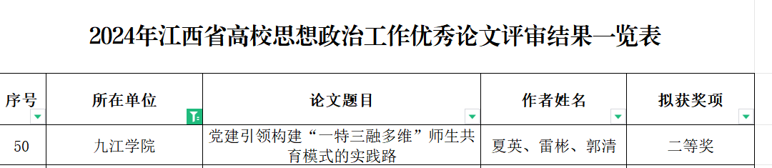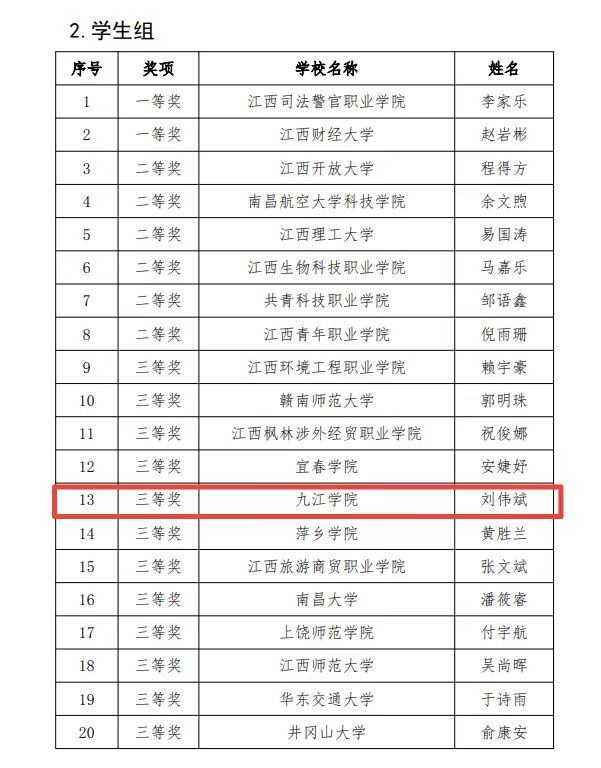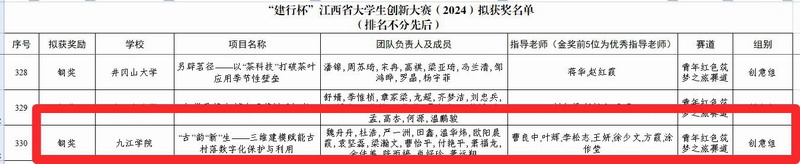 10月,学院地理信息科学专业A2342班吴细妹同学在“江西省教育改革与创新研讨会(2024)主题征稿活动”中荣获三等奖。11月,在2024老员工社会实践成果“千校千项”网络展示活动中,公司“赓续共青精神,智助乡村振兴”三下乡志愿服务队荣获2024年全国老员工社会实践成果“千校千项”网络展示优秀项目。11月,在“牢记嘱托强国有我 行走赣鄱感恩奋进”江西省高校学子暑期大思政实践活动优秀实践成果评选中,公司获得优秀实践团队三等奖,员工刘伟斌获得优秀实践个人三等奖。11月,公司A2451班刘锦澜同学和A2452班方文才同学在校2024年“微团课”大赛中分获二等奖和三等奖。11月,公司代表队在学校2024年第四届汉语英雄大赛中荣获三等奖。12月,公司古艺婷同学荣获2024年江西省“三下乡”社会实践优秀个人荣誉称号。