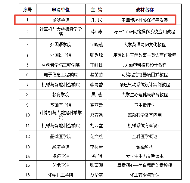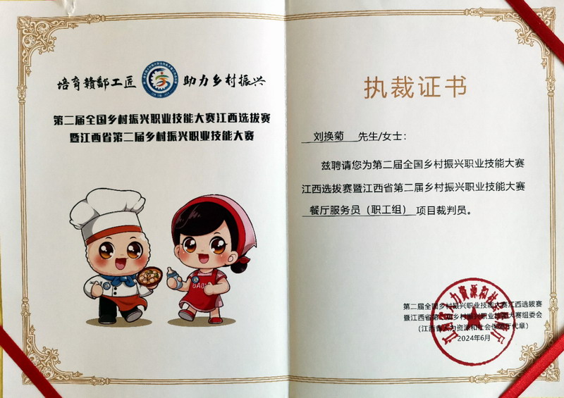 贾超老师申报的《酒店英语(上)》和刘换菊老师申报的《酒店餐饮管理》2门课程获批威廉希尔体育课程思政示范课程;刘换菊老师申报的《酒店餐饮管理》课程获批威廉希尔体育校企合作课程;曹良中老师主讲的《差之毫厘,谬以千里——地理配准的原理与实现》案例、刘换菊老师主讲的《“国宴——中国最顶级的饭局”今昔对比》案例和李翔宇老师主讲的《锦心绣口绘山河——全球化语境下旅游从业人员的核心素养图谱》3项课程思政教学案例集获批校级优秀课程思政教学案例。郭清老师主编的校级立项教材《江西省非物质文化遗产保护与发展》已于2024年1月出版,朱民博士主编的《中国传统村落保护与发展》纸质教材获批2024年校级教材建设立项项目。刘换菊教师报送的“劳动教育典型案例”《创新“5+1”劳动育人模式,提升员工劳动素养》荣获二等奖。